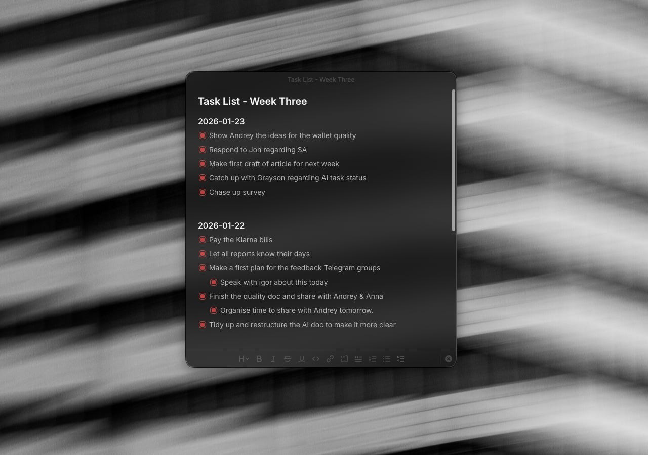 I use Raycast notes over Obsidian (which would also work) purely for the fact that Raycast notes persists at the side of my screen when I open another window. Being consistently reminded that these things need doing and being able to see them consistently is really helpful. Sure there is a little bit of friction there, and it would probably be a bit tighter/neater in Obsidian, but I am ok with the small level of friction. In this case it is quite helpful.